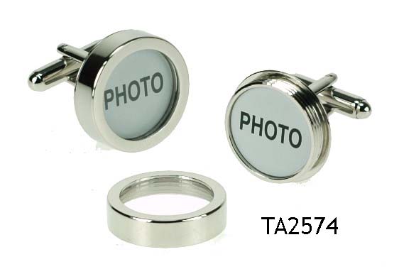 A set of rhodium plated cufflinks which can be opened so that a small photo or picture can be inserted into them.