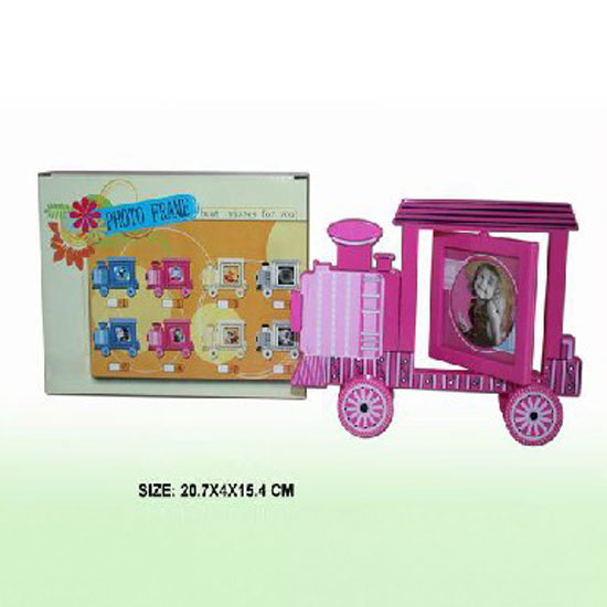 Presented here is a photograph frame with a locomotive design. The pinkish construction showcases a girlish accent. This picture frame is an ideal choice for showcasing your precious moments.