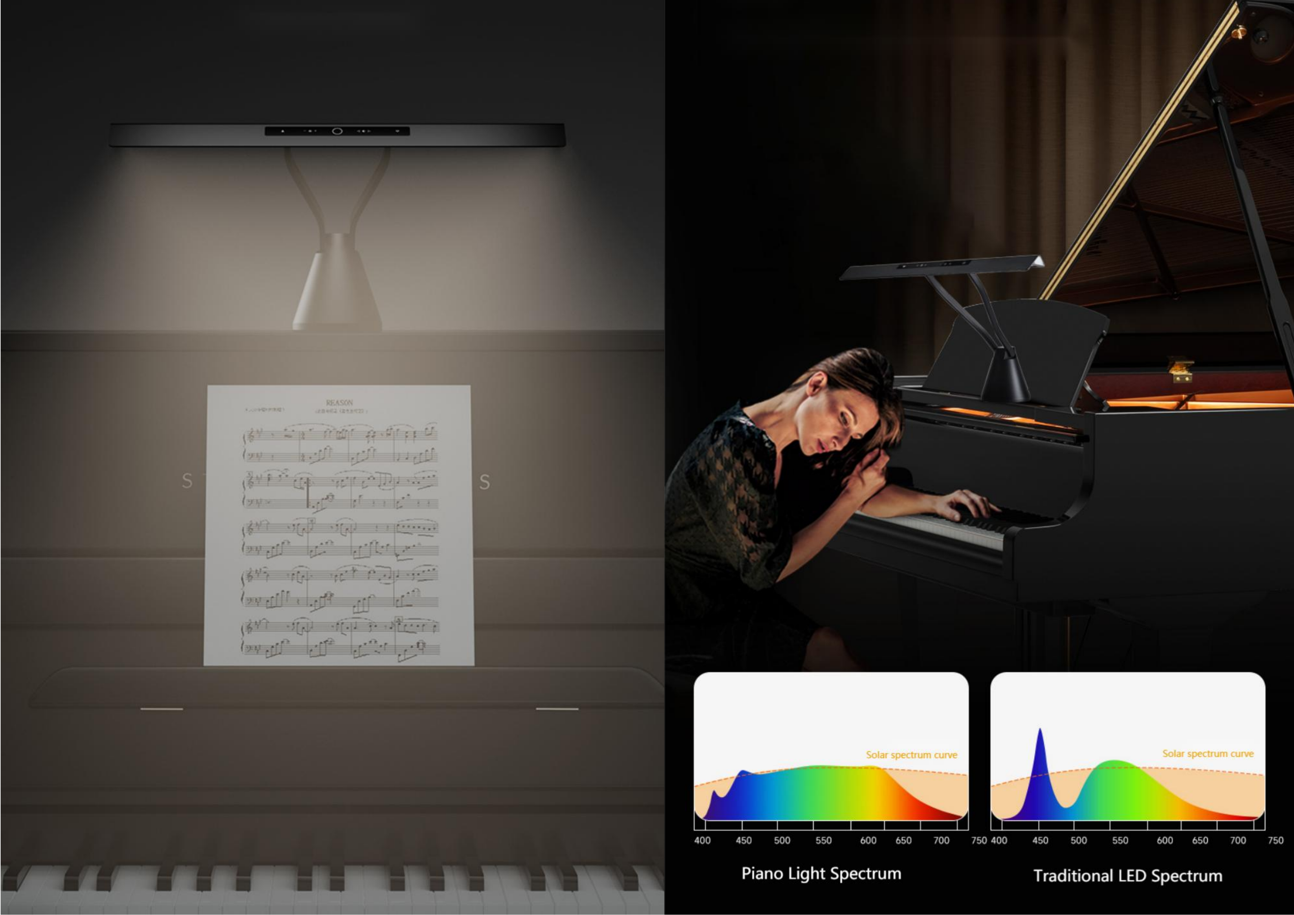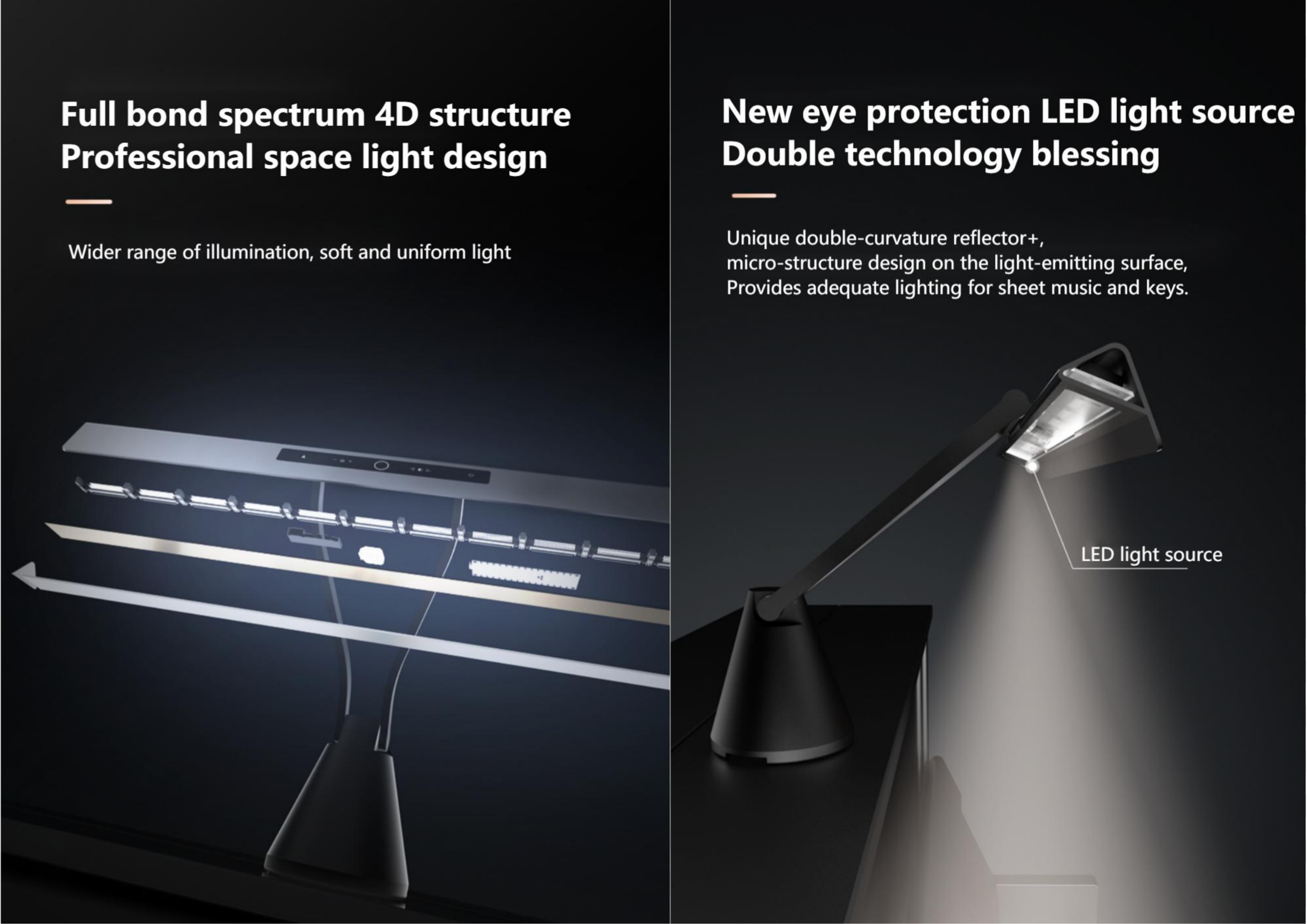 Unique double-curvature reflector+, micro-structure design on the light-emitting surface, provide adequate lighting for sheet music and keys.