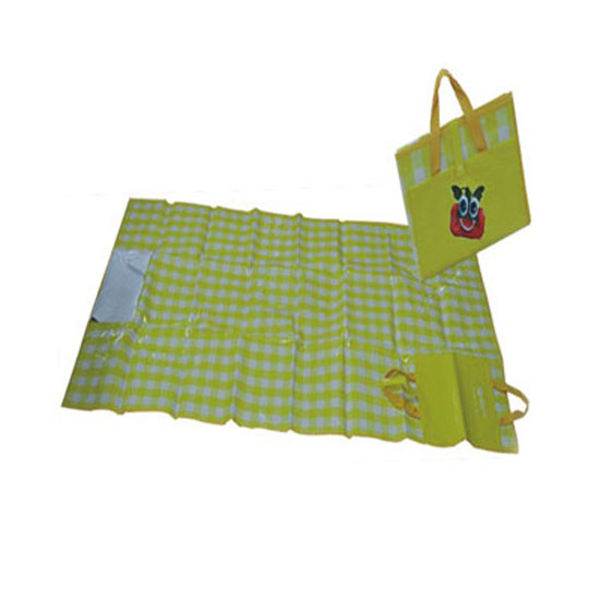 This is a practical mat designed for beach and picnic use. It comes in a rectangular shape with white and yellow checked patterns. This mat can be folded into a handbag appearance for easy carrying.
