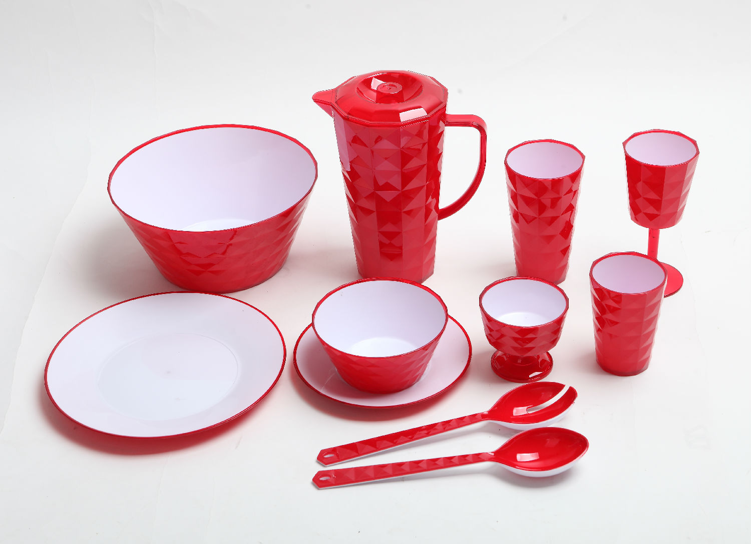 The set included two-tone pitcher, two-tone wine glass, two-tone tumbler, two-tone bowl, two-tone plate, two-tone salad fork and spoon.