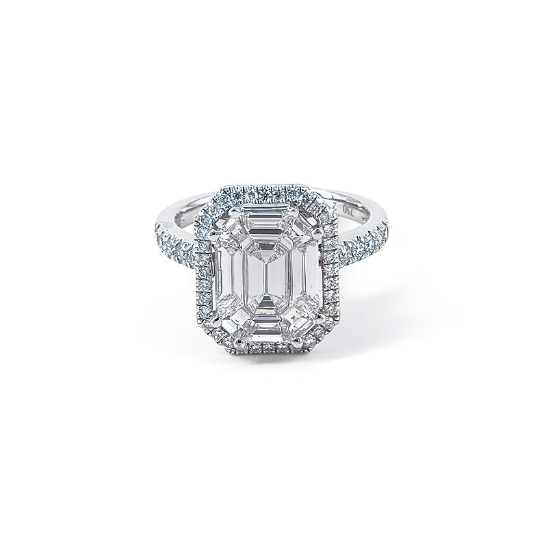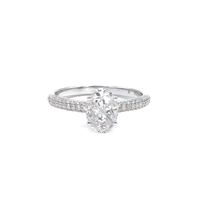 Our natural, VVS1 clarity, G+ colour pie cut diamonds are carefully matched and polished to shape together an illusion of a larger solitaire fancy cut diamond. (i.e. emerald-cut diamond, pear-shape diamond, asshcer-cut diamond, star-shape diamond, round-cut diamond, heart-shape diamond)