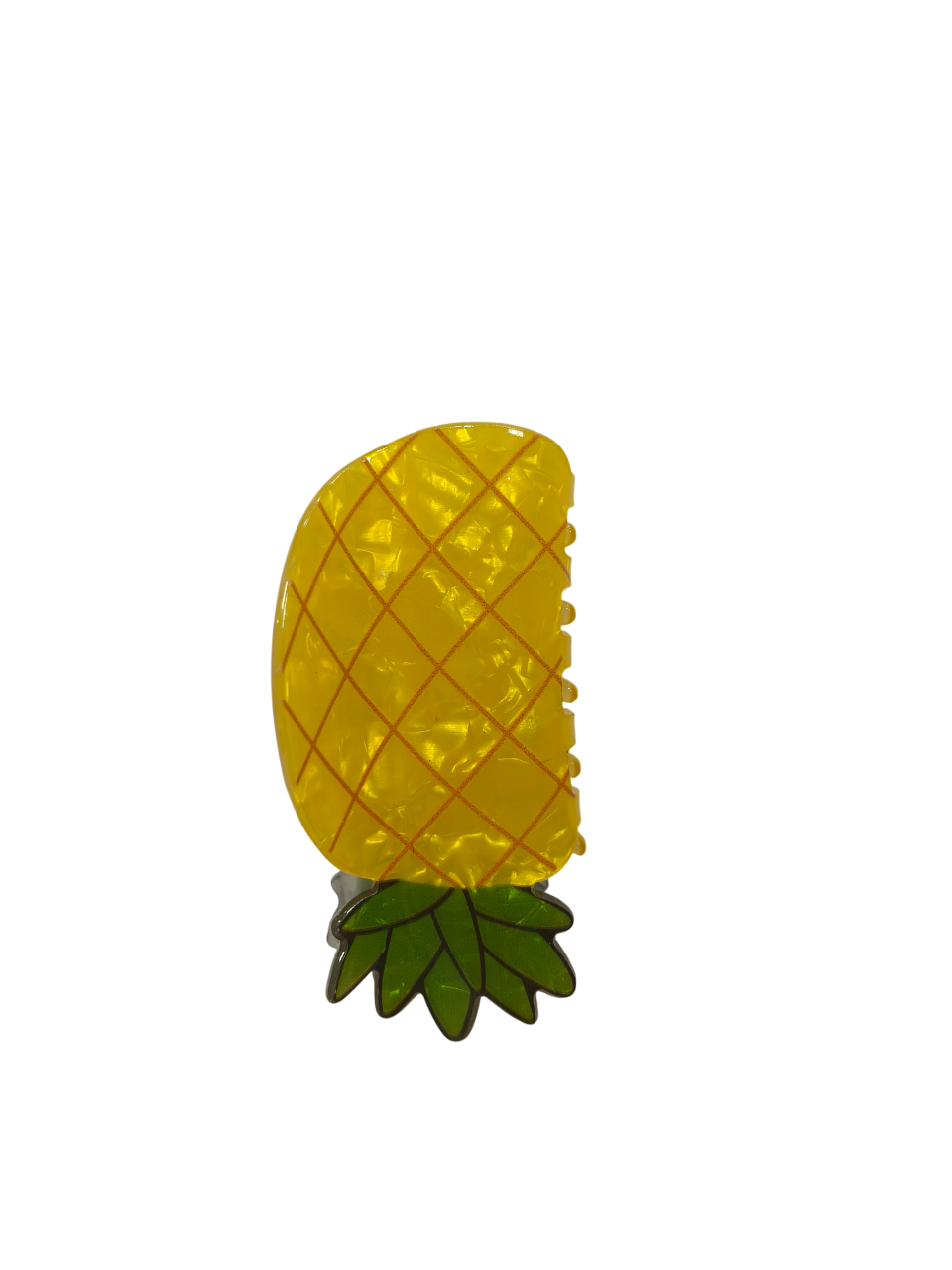 This hair clip is inspired by the pineapple, a tropical fruit known for its vibrant and distinctive appearance. The design mimics the pineapple's unique shape, with the textured, grid - like pattern on the body and the leafy top. It likely aims to bring a touch of tropical charm and fun to hairstyles, appealing to those who love bold, nature - inspired accessories and want to add a lively, exotic element to their look.