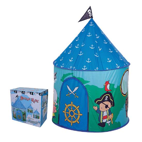 This pirate tent is shaped like a dome and is ideal for play indoors and outdoors. The tent comes with a door that can be rolled up and has a meshed window to facilitate ventilation. The tent has pictures of pirates and anchor patterns printed on the exterior.