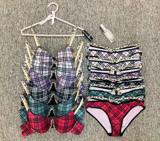 Add a trendy twist to your lingerie collection with this Plaid Pattern Lingerie Set. It features classic plaid designs in various color combinations (such as pink-purple, purple, black, teal, and red) and is accented with leopard-print trim on the straps, merging vintage plaid charm with a bold, playful element. The set includes matching bras and panties, offering a coordinated and stylish look. Ideal for those who love to blend traditional patterns with modern details, this lingerie set delivers both fashion-forward style and everyday comfort, making it a versatile addition to any intimate wear wardrobe.