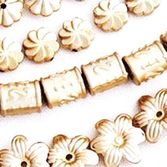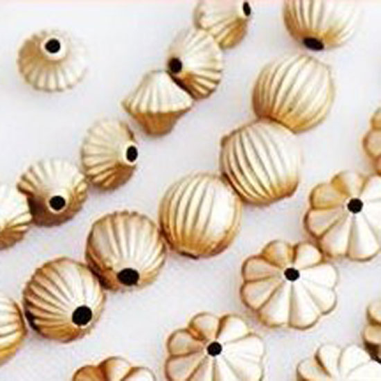 Presented here is a series of matt-gold beads made of plastic. The bead series is available in assorted shapes and sizes. They are widely used in the garment industry.
