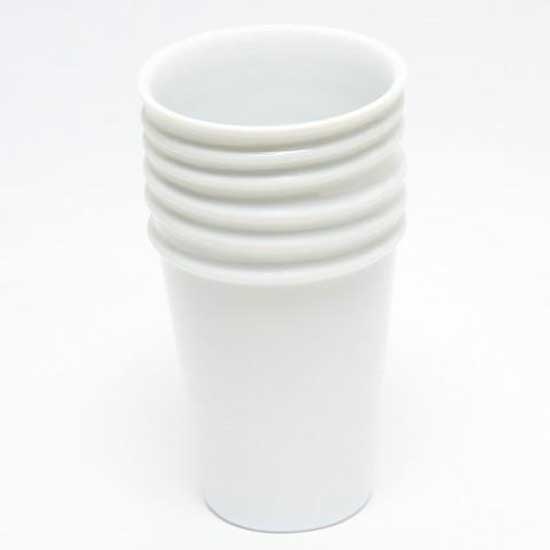 Displayed here is a plastic cup in a white color. It is characterized by a modern appearance. This plastic cup is a nice piece of tableware for serving guests at parties.