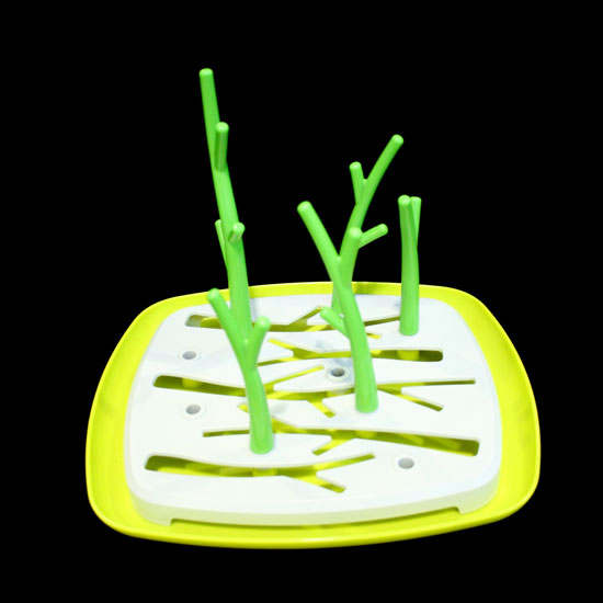 The picture displays a cup holder in a novel and stylish forests design. The green tree trunks can be used to hold cups of different sizes. The slots in the base are for streamlining water. The cup holder is suitable for modern home and offices.