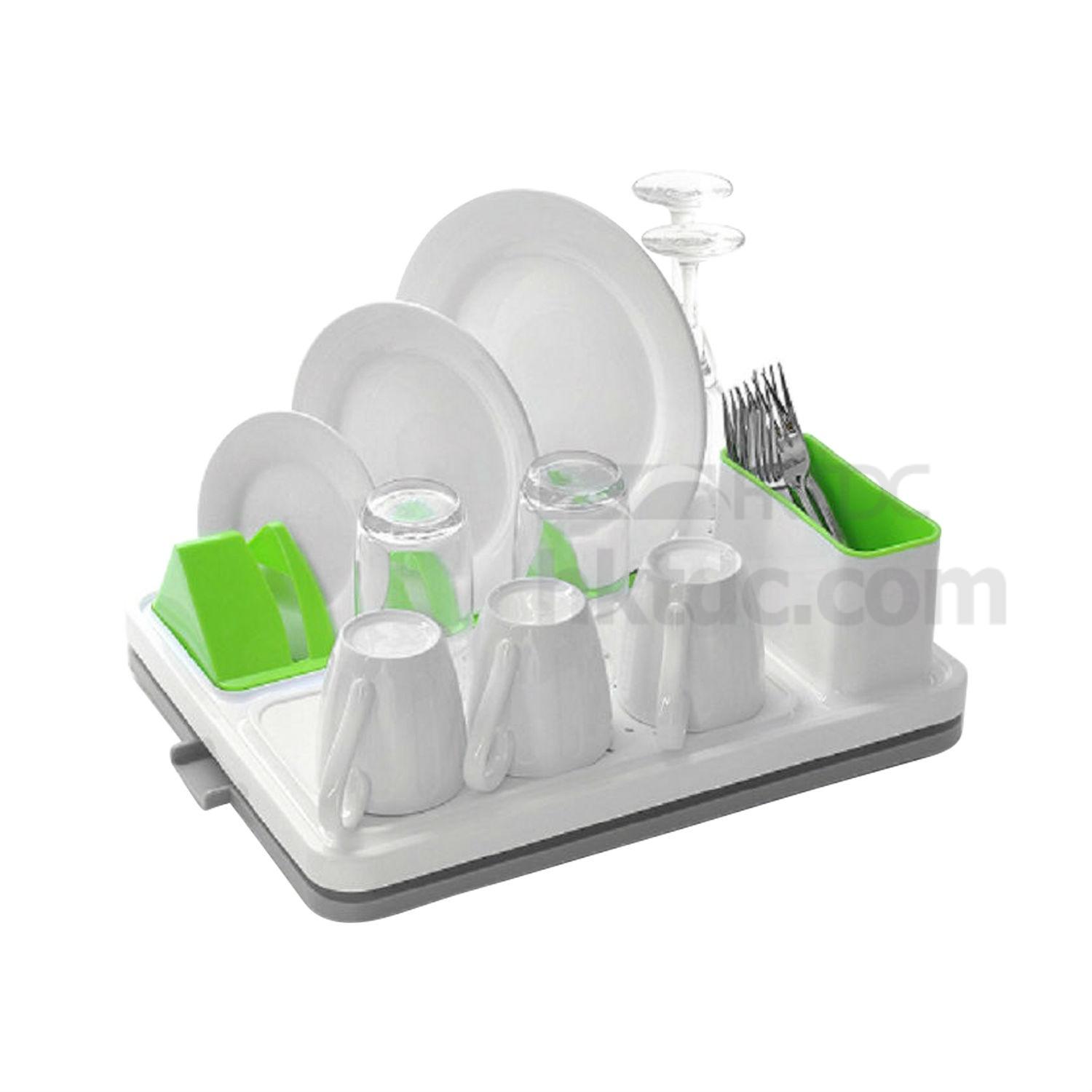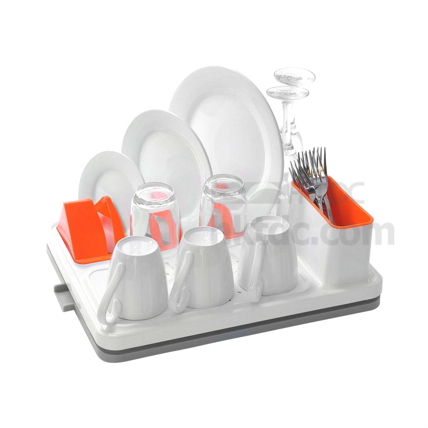 Highlighted here is a plastic dish strainer rack for keeping your tableware dry. It is rectangular shaped and has a dish rack on the side and a small holder box for storing knives and forks. This dish strainer rack has a movable drainage nozzle and is an excellent addition to every kitchen.
