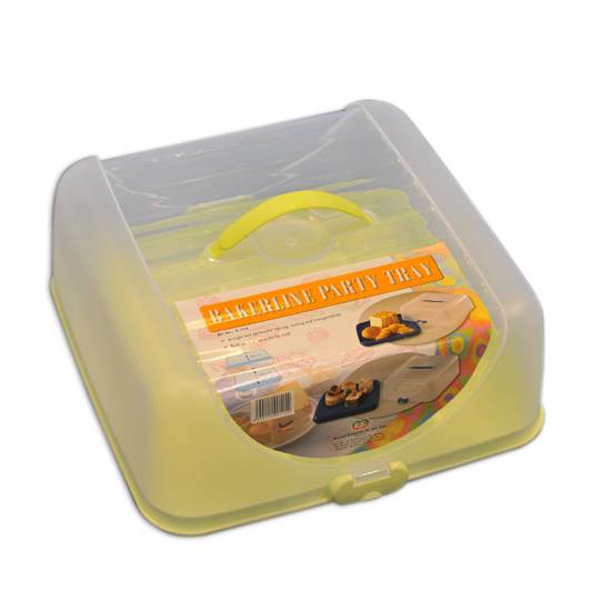 The food tray is made of plastic. It has a comfortable handle. It has a safety lock at front.