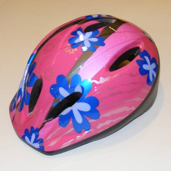 This is a plastic helmet of outmold construction. It can be used to protect children's heads from getting hurt while cycling or skating. There are holes on the helmet with good ventilation.