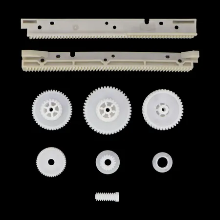 • Gear Set which is make of POM & POM + Glass Fiber in Orginal Colour. It is a transmission machinery both in toys & Household Electric Appliance. Specifications: Gear 2.1 * 1 pcs; Gear 2.2 * 1 pcs; Gear 2.3 * 1 pcs; Gear 2.4 * 1 pcs; Gear 2.5 * 1 pcs; Clutch 2.6 * 1 pcs; Worm Gear 2.7 * 1 pcs; Rack 2.8 * 1 pcs; Rack 2.9 * 1 pcs. Custom Made is also Welcome. Please provide the 2D & 3D Engineering Graphic for making the Quotation individually.