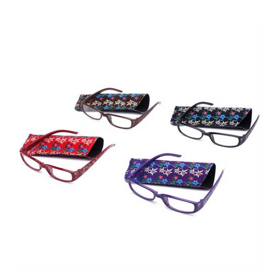 This is a collection of plastic reading glasses that comes with a classic full-rimmed design. Each pair of reading glasses comes with a matching pouch for easy storage. The tapered temples are accented with floral patterns for a decorative touch.