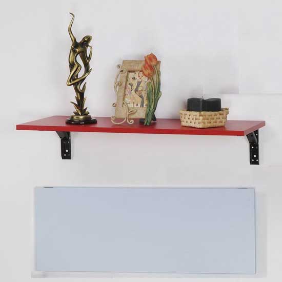Displayed is a plastic shelf coated with a metal sheet and PVC veneer. It features a rectangular-shaped surface with a spacious size. The shelf is securely bolstered by two folding brackets in black.