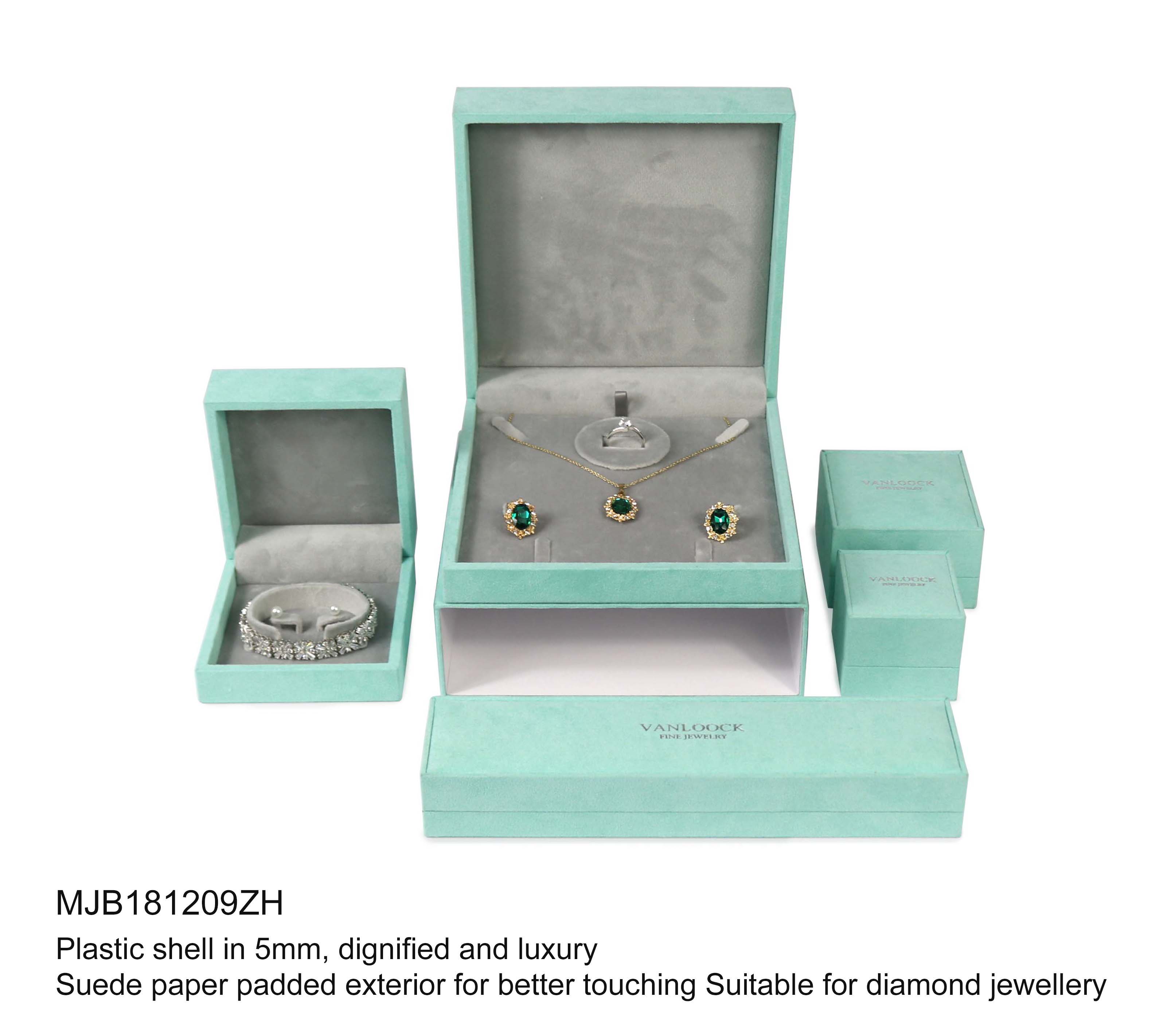 1) Ring box: 59 x 61 x 30/20mm, 2) pendant box: 82 x 84 x 30/20mm, 3) earring & watch box: 105 x 107 x 30/20mm, 4) set box: 180 x 180 x 30/20mm, 5) bracelet box: 254 x 60 x 20/15mm