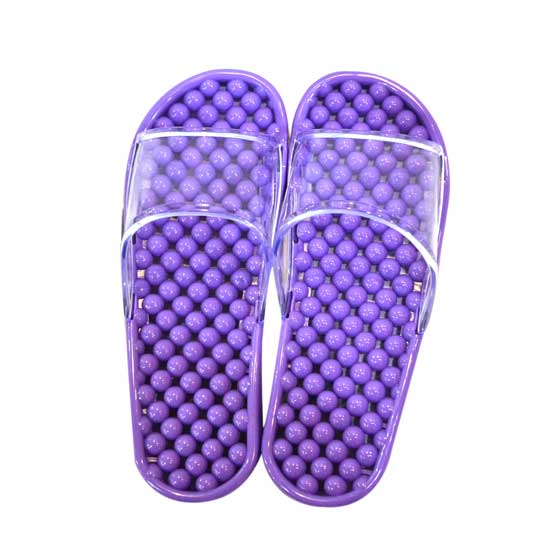 Displayed is a pair of plastic slippers in purple. Designed with bubbles at the bottom, this pair of slippers feels like walking on a rocky road when you wear it, which can bring some health benefit. This pair of slippers is suitable for home.