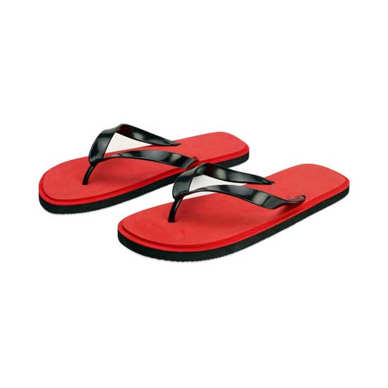 This is a pair of flip-flops with a two-toned design. Each piece features a simple yet eye-catching appearance in bright red and dark black. This pair of slippers is an ideal casual choice in the hot summer.