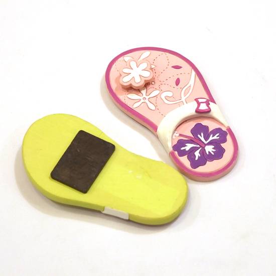 The slippers are made of plastic and are light in weight. Each flat sole has a rectangle black block for preventing the wearers from falling while walking on the slippery surface. The slippers have straps for holding the wearers' feet.