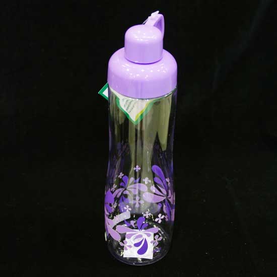Displayed is a high-quality water bottle that is crafted of acrylic plastic material. This crystal clear water bottle boasts an abstract purple print design. Use this fine bottle for function and style.