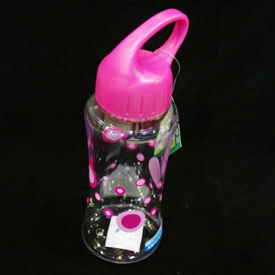 Displayed is a high-quality water bottle that is designed with an integral handle. This crystal clear water bottle boasts a bubble-style print design. Simply use this fine bottle for function and style.