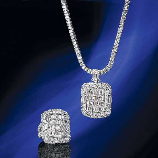 The platinum diamond jewelry includes a finger ring and a necklace. They are manufactured by Kdion, a renowned Japanese high-end brand that makes the finest emerald cut diamonds and pink diamonds. The ring and necklace dazzle your eyes with incessant brilliance.