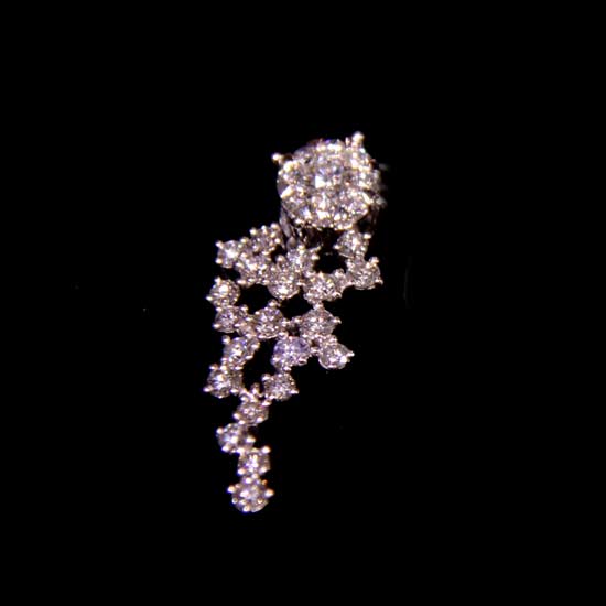 Featured here is an ornate platinum diamond pendant that flaunts shimmering beauty with its multi-faceted diamonds. The centerpiece of this pendant is a round-cut diamond. The pendant is further adored by 29 pieces of smaller diamonds arranged in a random pattern. Simply wear this for a touch of elegance.