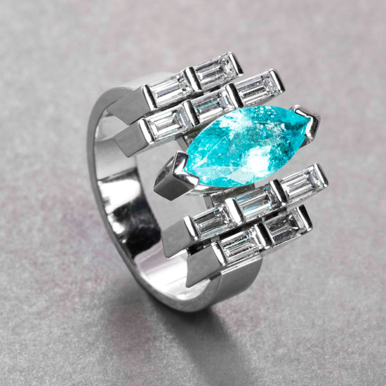 Featured here is a platinum ring with sophisticated details. The 1.59ct Paraiba tourmaline is surrounded with ten 1.12ct baguette diamonds, presenting an opulent touch. This platinum ring is ideal for assorted occasions.