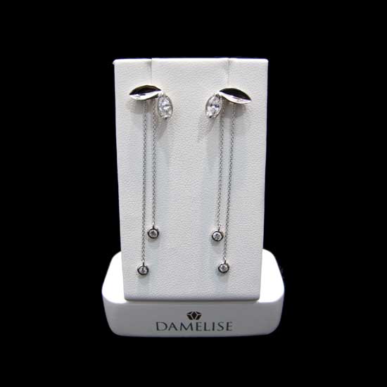 These elegant earrings feature the design of dangling chains. The olive-shaped post mounts are studded with twinkling white diamonds. The contemporary earrings are wonderful accessories for any occasion.