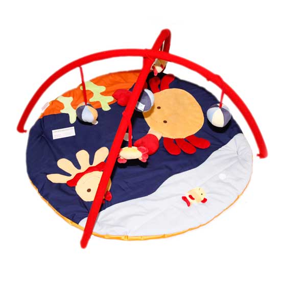 This baby play mat comes in a round shape with a lovely marine life print. It boasts crisscrossing toy bars with soft balls and soft animals for added fun. This comfy and beautiful play mat is suitable for newborn babies.