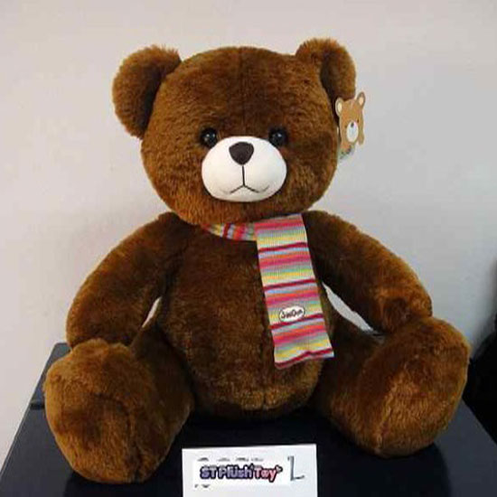 This is a plush bear that comes with a sitting posture. It is accented with a colorful striped scarf for a touch of style. This plush bear is an ideal gift choice to entertain your little one.