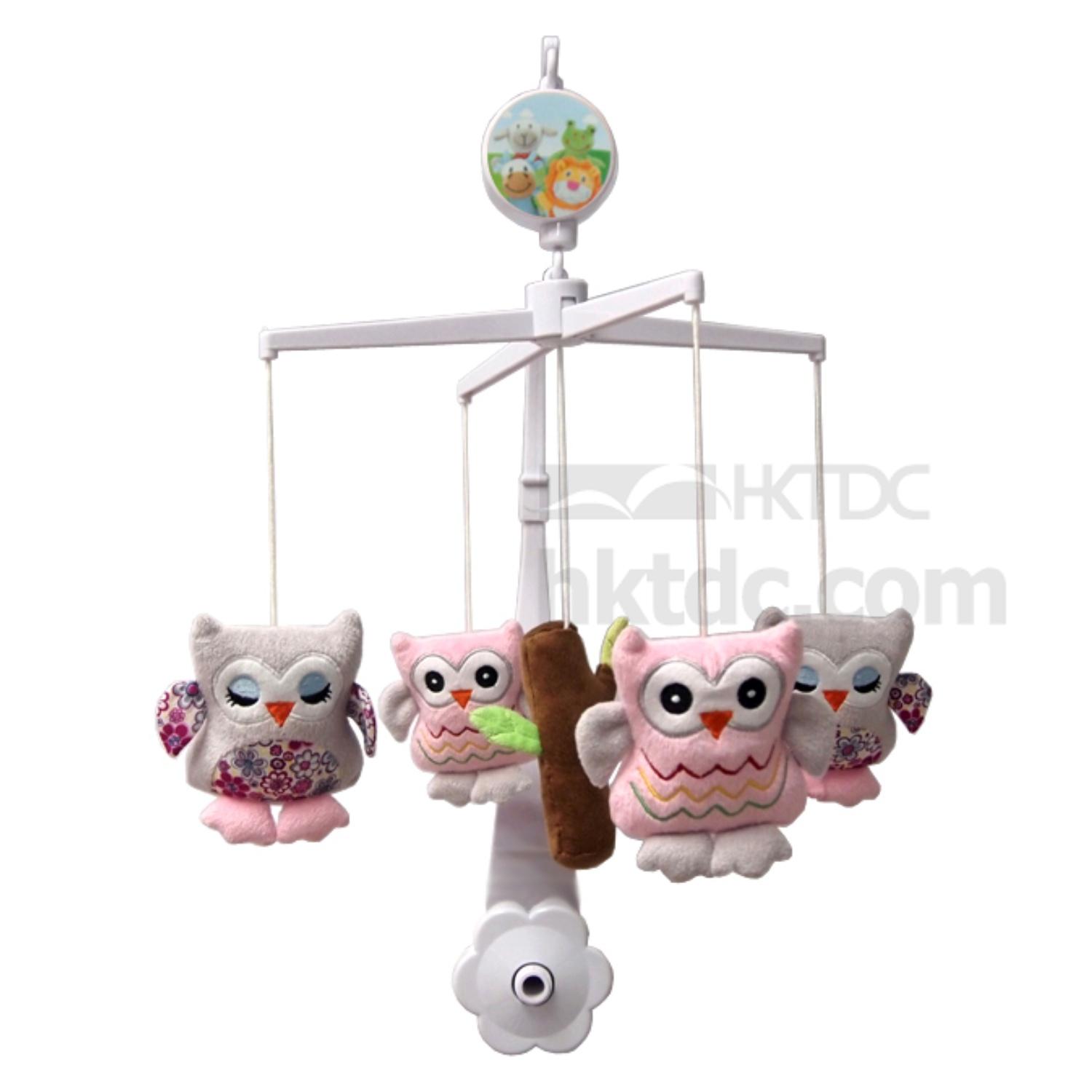 Four soft toys that gently turn around to the sound of a soothing melody.