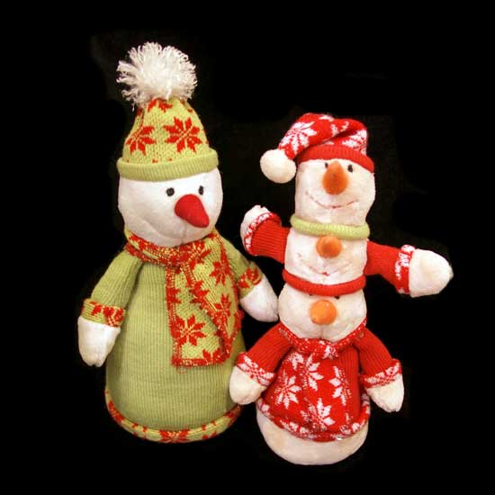 These plush toys come with a snowman look for cuteness. The left snowman wears a set of green clothes with red snowflake patterns. The right one features three snowmen in red suits stacking together. These plush snowmen make a great gift for friends.