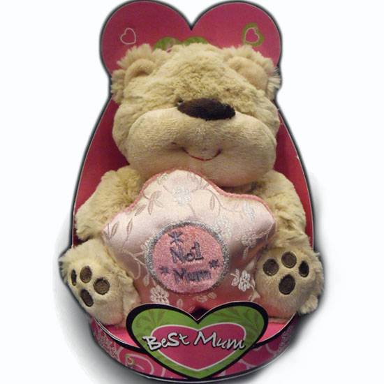 Featured is a plush teddy bear which has fluffy brown hair and a smiling face. It is holding a flower-shaped cushion in its hand with words "No1 Mum". The bear makes a perfect gift for your mum on Mother's Day.