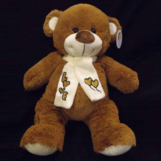 This featured item is a teddy bear made of plush. The soft toy is further decorated by a white scarf, making this item look cute. This product has a smooth and comfortable surface.