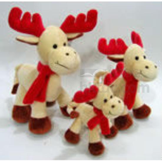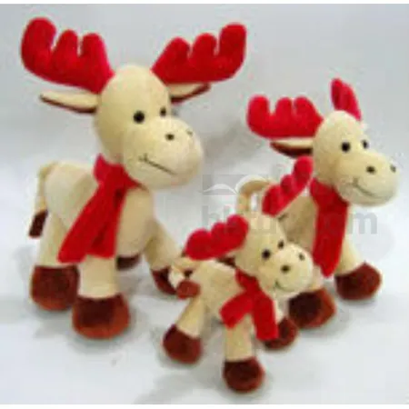 Displayed is a collection of plush toys featuring the appearance of deers. The adorable deers come with horns and wear a red scarf, making it an amazing gift for Christmas. Highlighting smiley faces, the deers will definitely bring you and your friend a Merry Christmas.