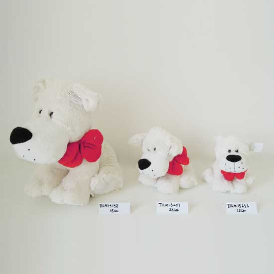 This is a white plush sitting dog with a red bowtie. It is made with excellent craftsmanship and attention to detail. This lovely plush toy comes with a soft texture for enhanced comfort.