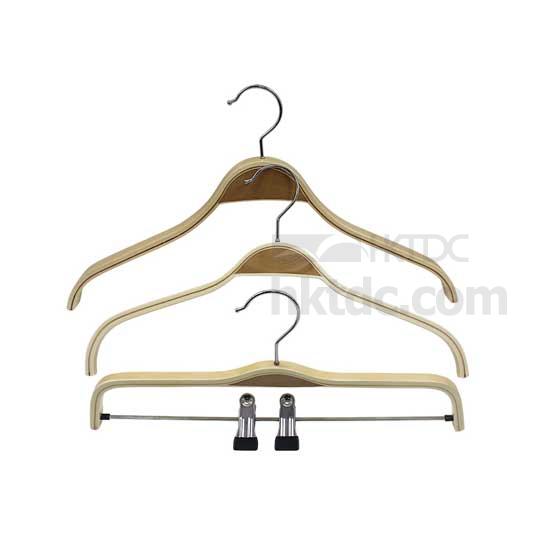 Displayed is a plywood hanger that comes with a smooth contour. The natural finish gives the piece a homey feel. Multiple clips can be attached on the hanger bar for a flexible use.