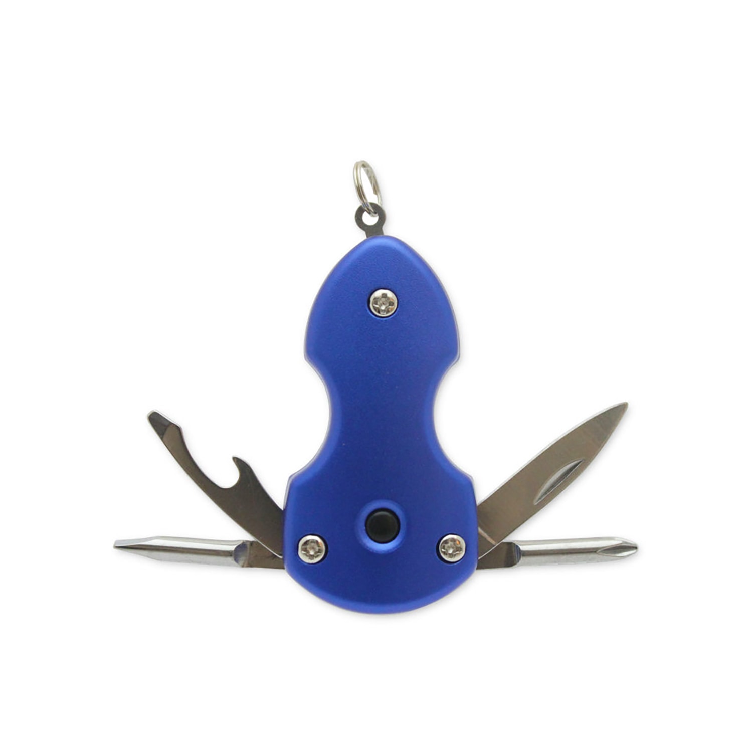 Multi-purpose pocket knife with LED flashlight includes the following features: