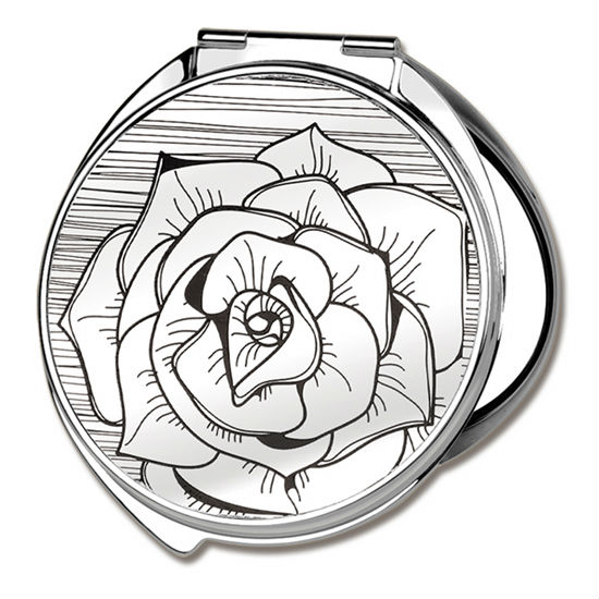 Keep this beautiful mirror with you for quick makeup checks wherever you are. Finished with shiny nickel plating, the case boasts a striking floral motif with a blooming rose outlined on the top. This folding mirror features two mirrors for both normal and magnifying reflections, which is just the right size for clutches or any pocket.