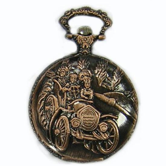 This pocket watch features an open-front design with a loop for attaching to a chain or string. It boasts car-themed engraved patterns on the brass-tone cover, adding a touch of vintage glamor to the entire piece. This pocket watch makes a great item for desk decoration or carrying in your pocket.