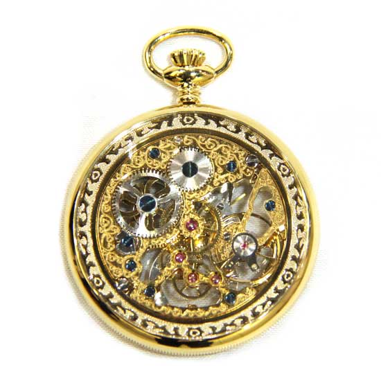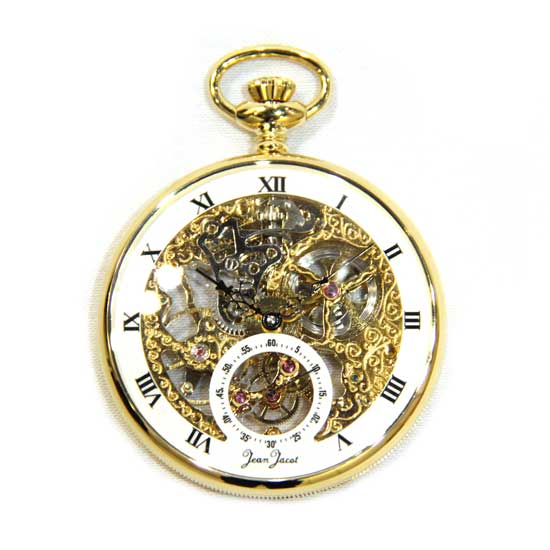 This exquisite pocket watch features a see-through design at the front center and the back a sophisticated touch. It comes with black roman numeral hour markers, hands and a sub-dial on the white dial. This fancy pocket watch made of metal is ideal as a gift.
