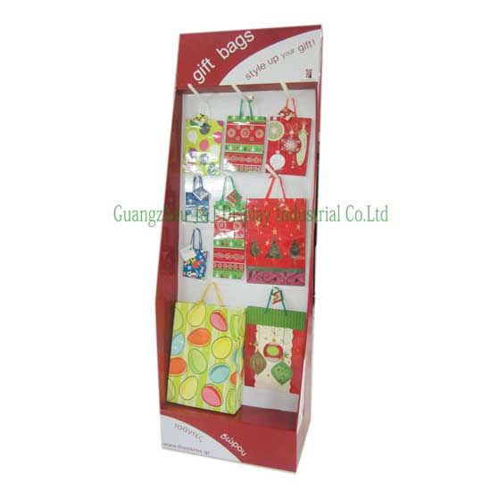This highlighted point-of-purchase display unit features a self-standing design. It comes with multiple hooks for displaying assorted gift bags in an organized way. This showcased point-of-purchase display unit is great for retail store use.