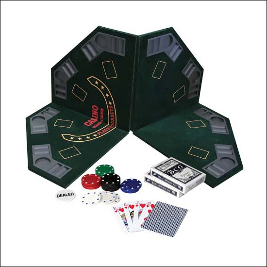 The poker top deluxe has a cardboard, two decks of playing cards, some chips and a dealer button