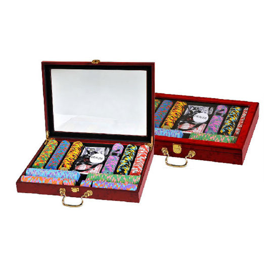 - Contains 500 chips, 2 playing card decks, 5 dices and 1 dealer button.