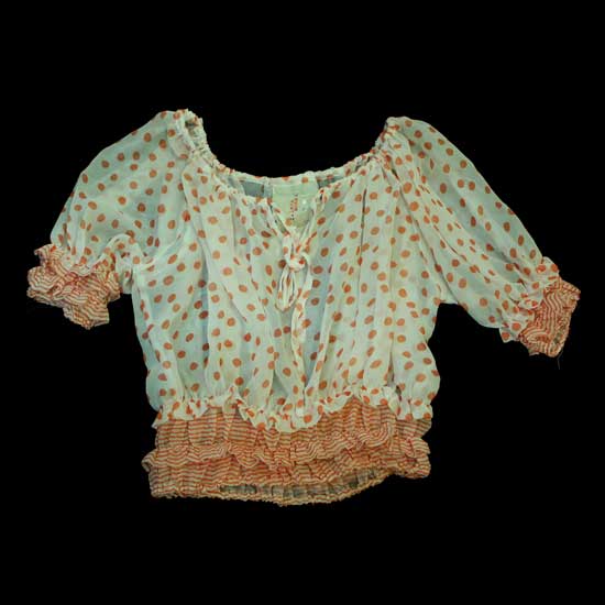 This fancy polyester chiffon blouse features sweet bubble construction. The orange dotted patterns and striped ruffle detail are sweet and charming. Pair this cute blouse with your favorite jeans or shorts for an elegant look in summer.
