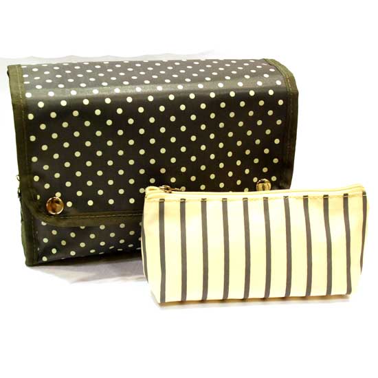 This high-quality polyester pouch comes with 2 pouches in different styles. The cosmetic case has a polka dot pattern and 2 metal button closures. The white cosmetic pouch has a classical stripe pattern and sturdy zipper closure.