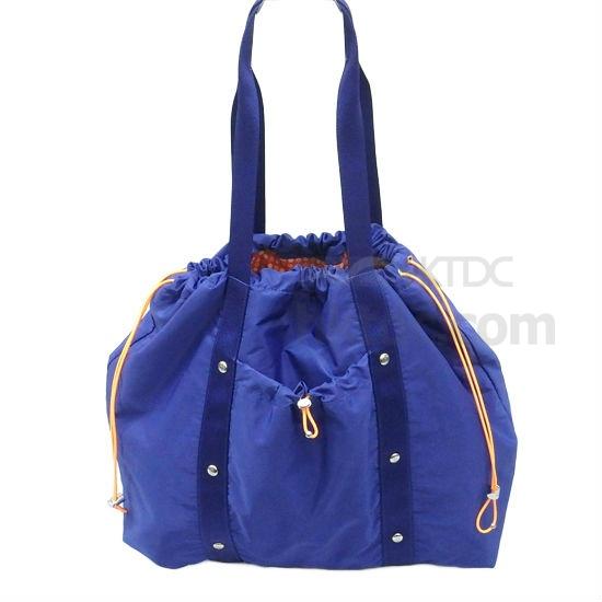 The pictured tote bag has a waterproof outer made of polyester and a polyester interior in contrasting colors. It has a spacious main compartment with an external pocket for storage and both have drawstring closure. This tote bag is adorned with metallic studs in gold tone and has two long handles for shoulder and hand carrying.