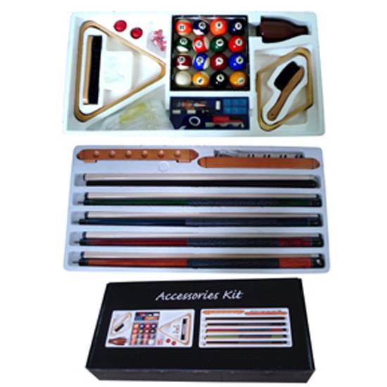 The featured product is a pool accessories set, the set includes everything you will ever need for a pool game, including the balls, the cues, the table brush, etc.