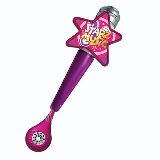 Shown is a pop star sing-a-long microphone with a built-in amplifier. This stage mic comes with two fun features including clapping hand or laughing music effect. Lights are flashing while music is playing. This lovely microphone practice kids singing skills and guarantees unlimited hours of fun.