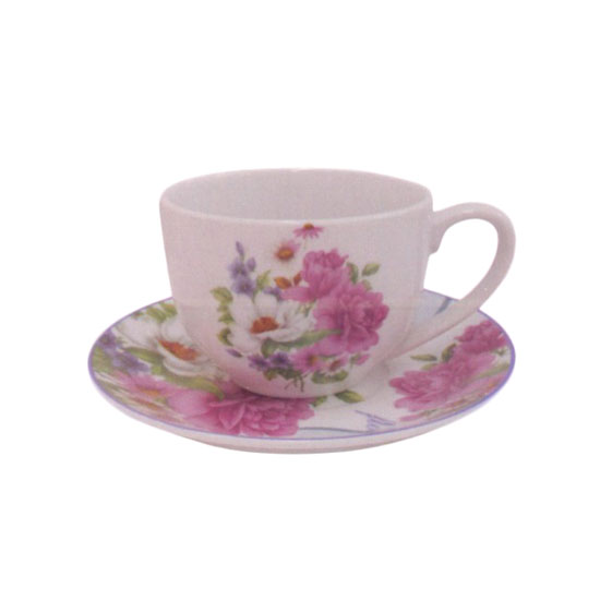 Displayed is a set of porcelain tea cup and plate featuring flower patterns. Made of food grade porcelain, this tea cup is safe to use. The large handle allows an easy and comfortable grip.